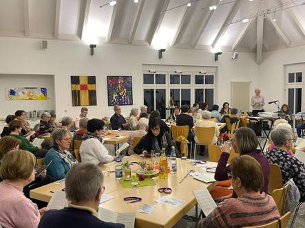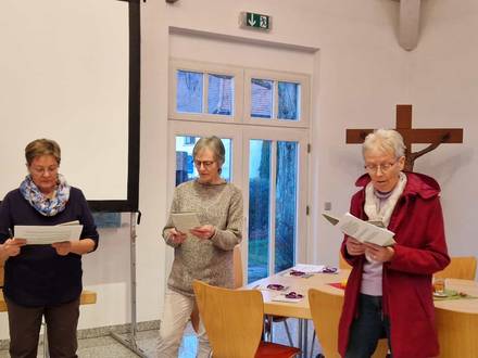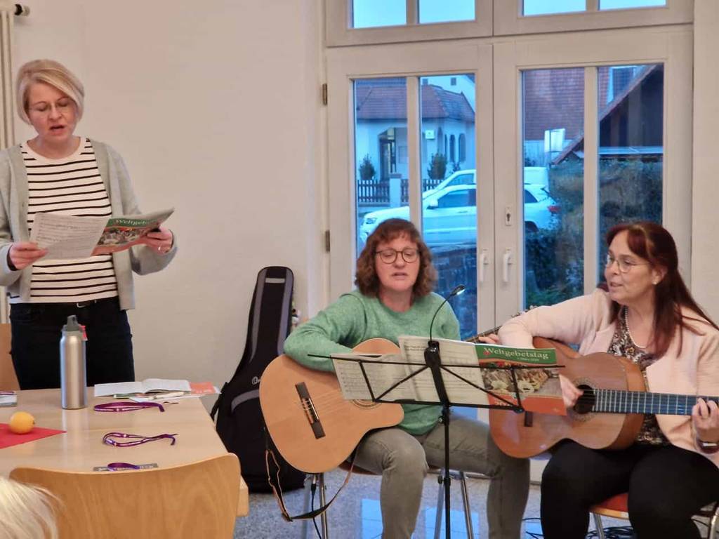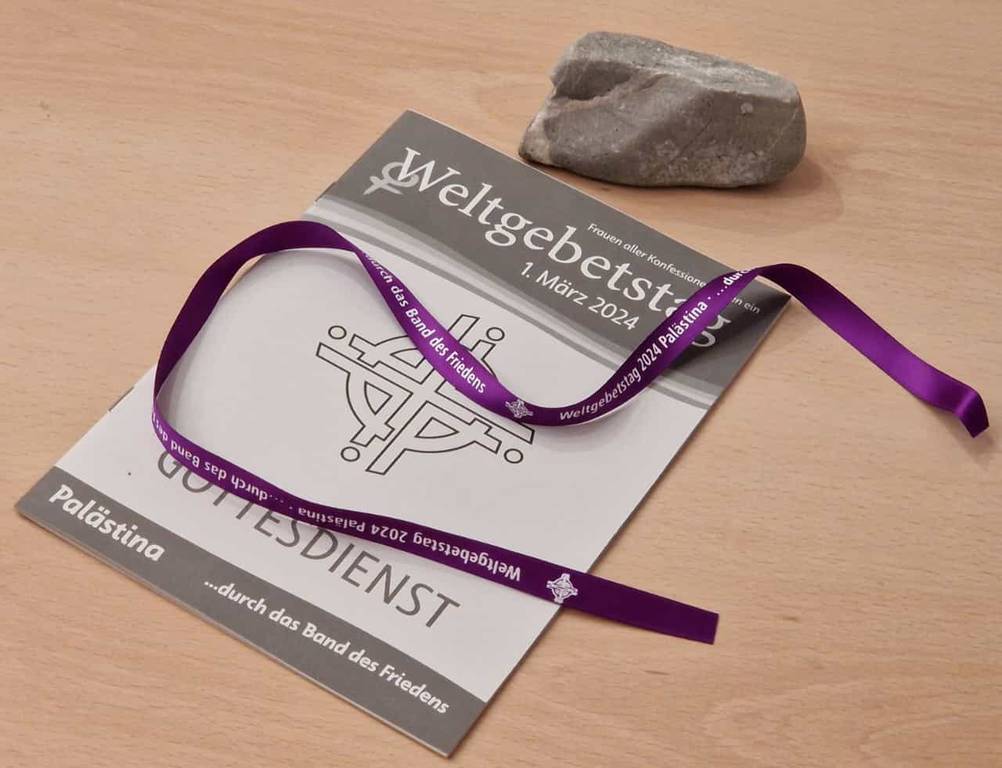 in Palästina. Wir stimmten uns auf den Abend mit leicht gängigen Liedern zum Weltgebetstag ein. Musikalisch untermalt wurde der Gottesdienst durch die Gitarrenbegleitung von Frau Sigrid Brandt und Margot Schneider-Söllner und durch die musikalische Unterstützung von Joanna Rippel. Wir lernten das Land Palästina durch einen kurzen Bildervortrag kennen und erlebten einen sehr schönen Weltgebetstag-Gottesdienst. Im Gottesdienst hörten wir das Vaterunser auf aramäisch, beteten es in der deutschen Übersetzung und verbanden uns dabei miteinander zu einem großen Band des Friedens. Am Ende gab es wieder einmal ein ganz besonderes Buffet mit herzhaften und süßen Spezialitäten aus Palästina. - Herzlichen Dank allen, die den Abend mitgefeiert haben und allen Menschen, die zum Gelingen des Abends im Vorder- und Hintergrund beigetragen haben.