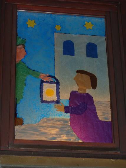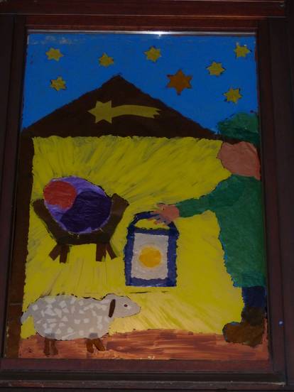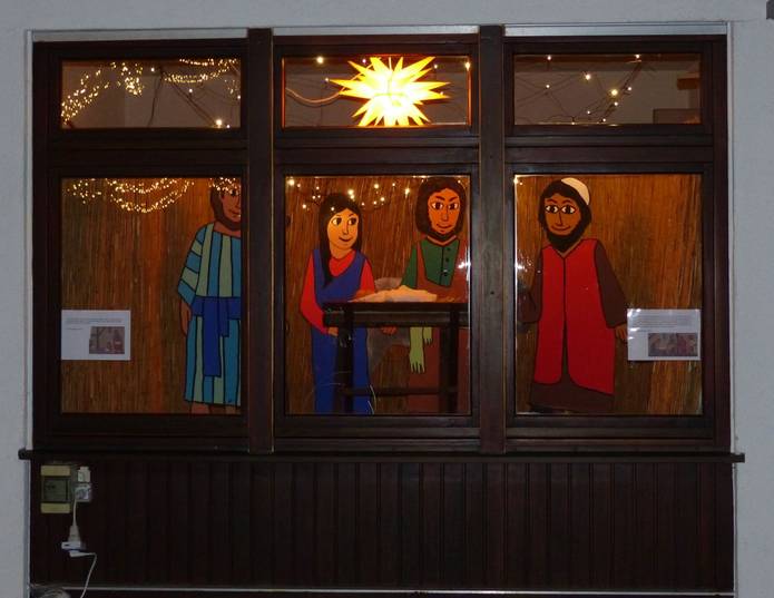 Den ganzen Advent über wurde ein neues Fenster an unserem Gemeindehaus mit Bildern zur Geschichte "Die 4 Lichter des Hirten Simon" von Gerda Marie Scheidl und Marcus Pfister erschienen im Nord-Süd-Verlag gestaltet. Das letzte Fenster wurde an Weihnachten enthüllt.