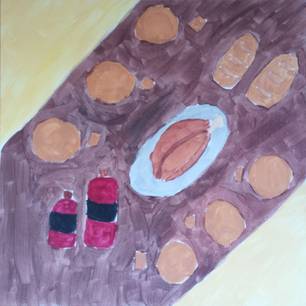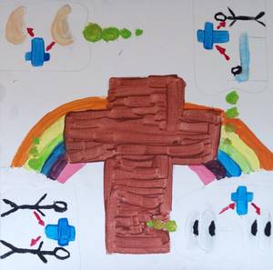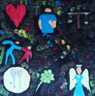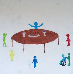 Deshalb habe ich Gottes Reich als Tisch gemalt, da es schon mitten unter uns ist, wenn man glücklich ist und jeder akzeptiert und wertgeschätzt wird.