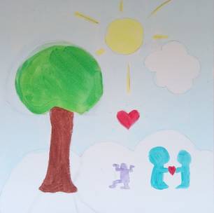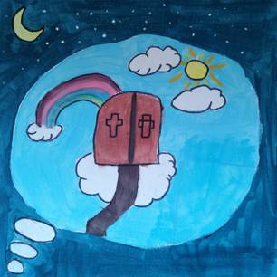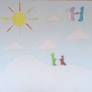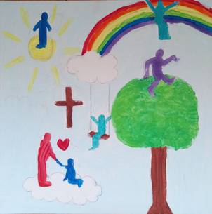 Man wird aufgenommen und wertgeschätzt. Ich habe „Gottes Reich“ nicht als Himmel oder Wolke gemalt, da diese Dinge für Menschen ungreifbar und unerreichbar sind, was Gottes Reich für mich nicht ist.