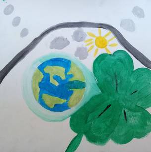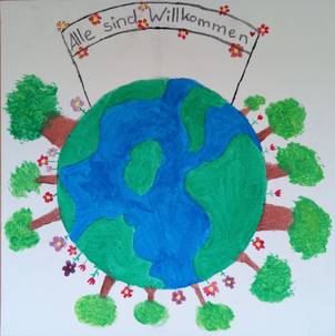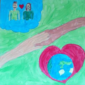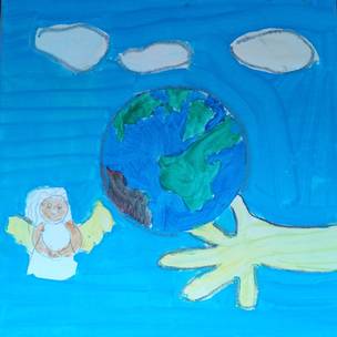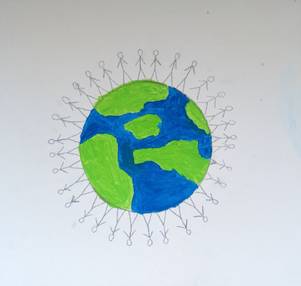 9. Das Reich Gottes ist für mich, wenn alle auf der Welt glücklich sind und Frieden haben. Deswegen habe ich eine Welt gemalt mit Menschen, die sich die Hand geben und glücklich sind