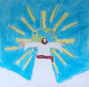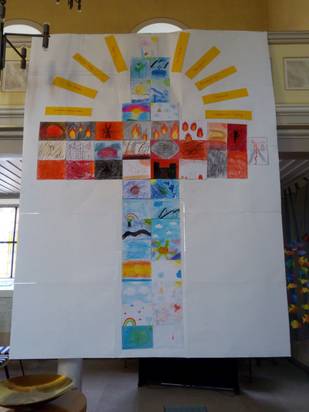Sichtbar auch in dem Kreuz hier vorne – Jesus, der die Höllenbilder durchbricht mit seinen Himmelbotschaften. Und die gelben Strahlen als Ausdruck dessen, wie unser Verhalten – angeregt aus den Gleichnissen - ausstrahlen könnte in eine bessere Welt.