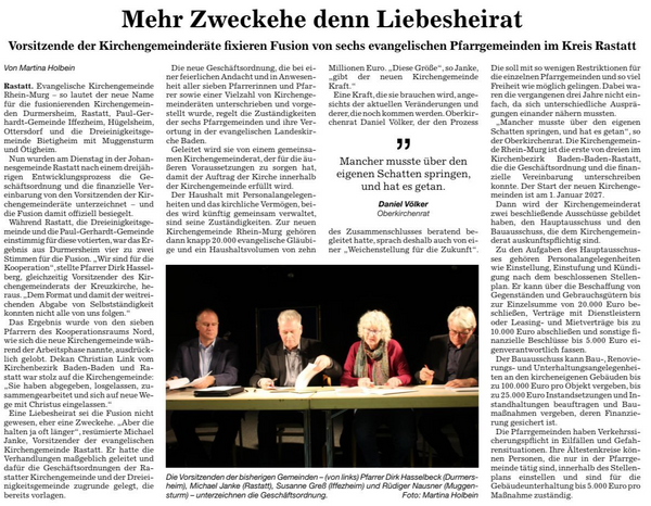 Evangelische Kirchengemeinde Rhein-Murg – so lautet der neue Name für die fusionierenden Kirchengemeinden Durmersheim, Rastatt, Paul-Gerhardt-Gemeinde Iffezheim, Hügelsheim, Ottersdorf und die Dreieinigkeitsgemeinde Bietigheim mit Muggensturm und Ötigheim.
