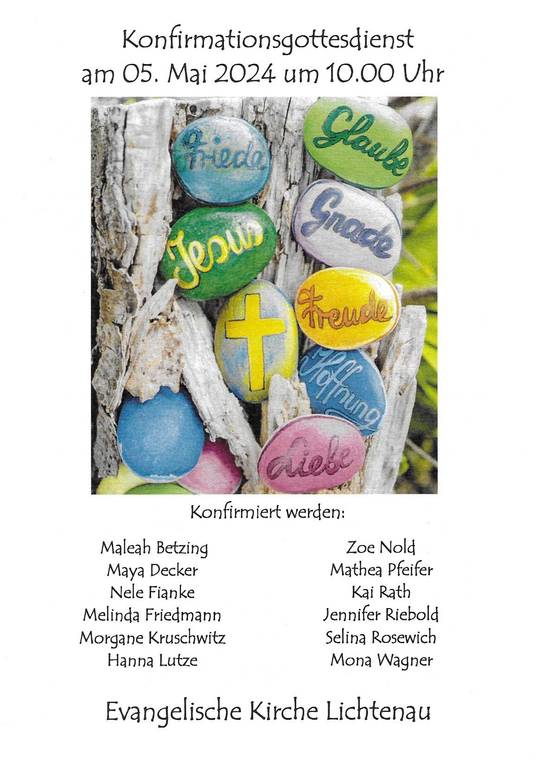 Am kommenden Sonntag, den 14. Mai, feiern nun die anderen 10 Konfirmanden und Konfirmandinnen aus Lichtenau und Rheinmünster ihre Konfirmation in der Ev. Kirche in Lichtenau.