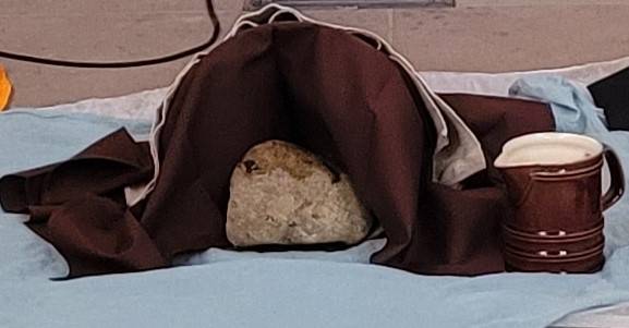 (Der Stein wird vor der Höhle weggerollt. Die Sonne wird vor der Höhle abgelegt.)