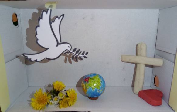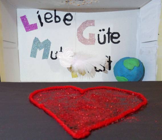 In meiner Box ist eine Friedenstaube für den Frieden, das Wasser für das Leben, der Baum für das Leben, der Stern für die Geburt Jesu, das Kreuz als Ausdruck für die Kirche.