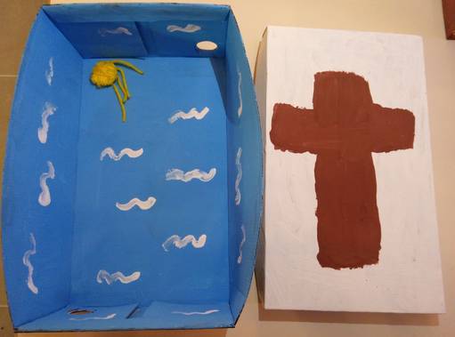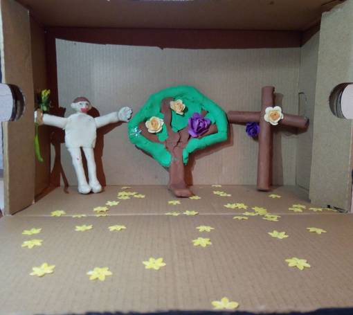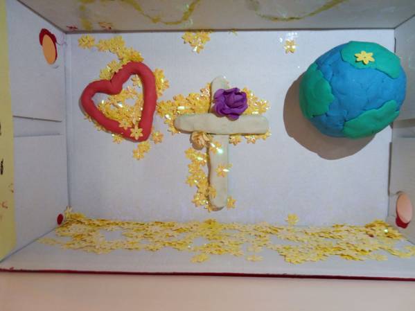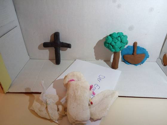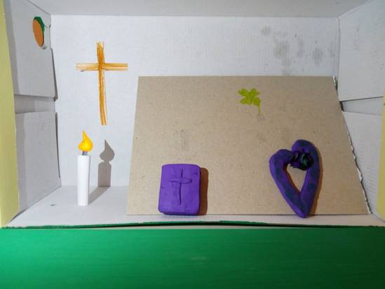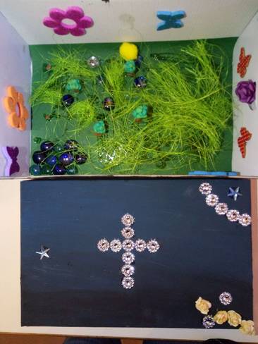 In der Box ist eine Kerze für das ewige Licht, ein Kreuz für die Kreuzigung Jesu, Blumen, Erde und Tiere als Zeichen der Schöpfung durch den lieben Gott.