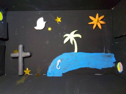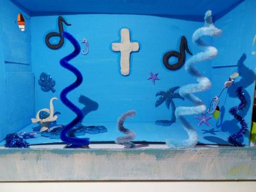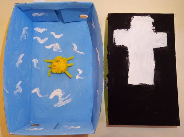 Ich habe meine Box so gestaltet, weil das weiße Kreuz auf dem schwarzen Hintergrund symbolisiert, dass Gott auch in dunklen Zeiten da ist. Dieselbe Bedeutung hat auch die Sonne in der Innenseite. Und das blaue Meer drum herum steht für Wasser und Hoffnung.