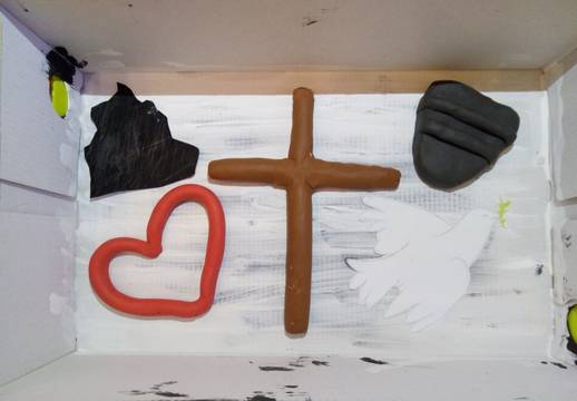 In meiner Box ist ein Jesuskreuz, ein Schild, ein Felsen, ein Herz und eine Friedenstaube.