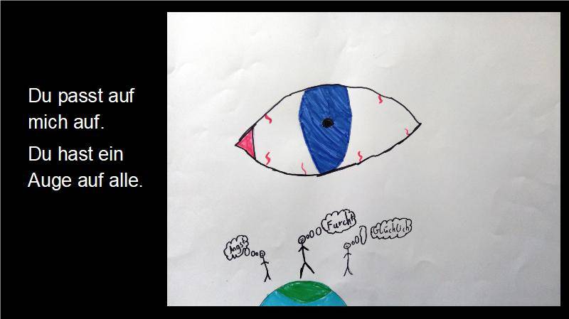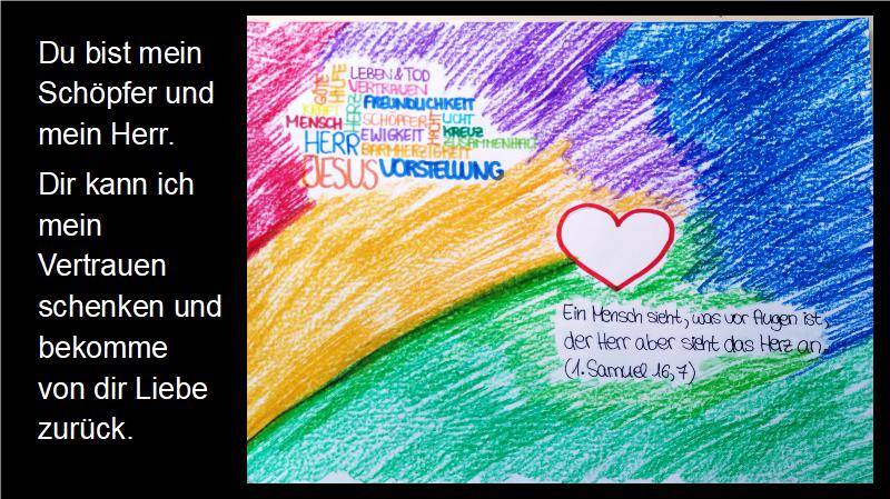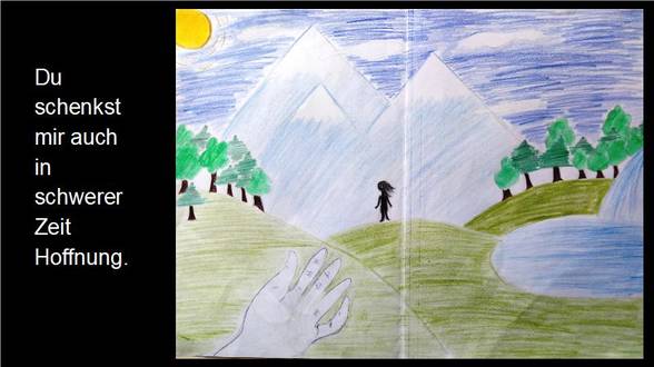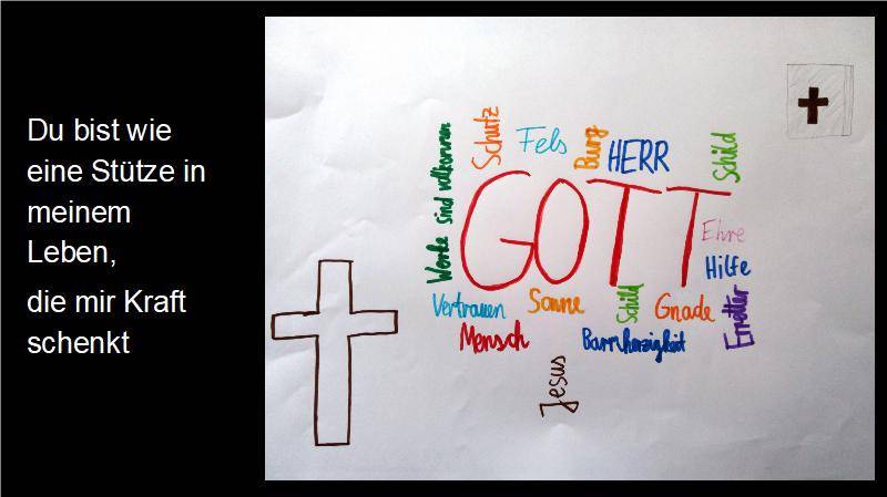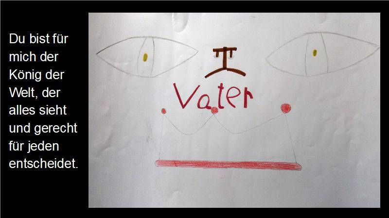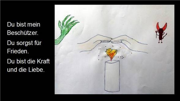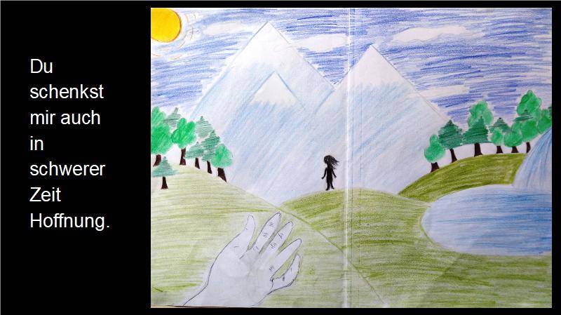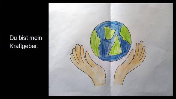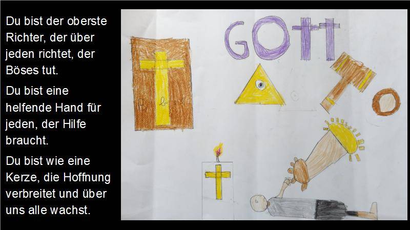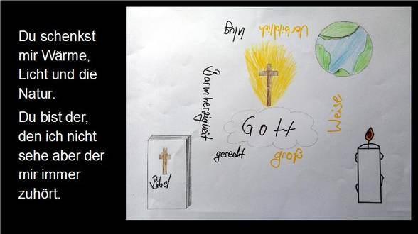 Ich glaube an Gott, der wie die Sonne uns Hoffnung gibt und unseren Glauben stärkt wie ein Baum, der immer größer wächst. Der uns wie ein Stern den richtigen Weg weist. Und an Jesus Christus, der sich für die Menschen geopfert hat.