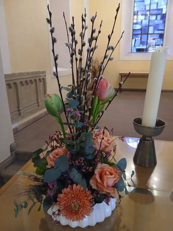 Das ganze Jahr über erinnert uns die Osterkerze an die Auferstehung Jesu. [Nur jetzt in der Passionszeit fehlt das Licht der Osterkerze – und macht deutlich, wie sehr wir dieses Licht in unserer Welt brauchen.]
